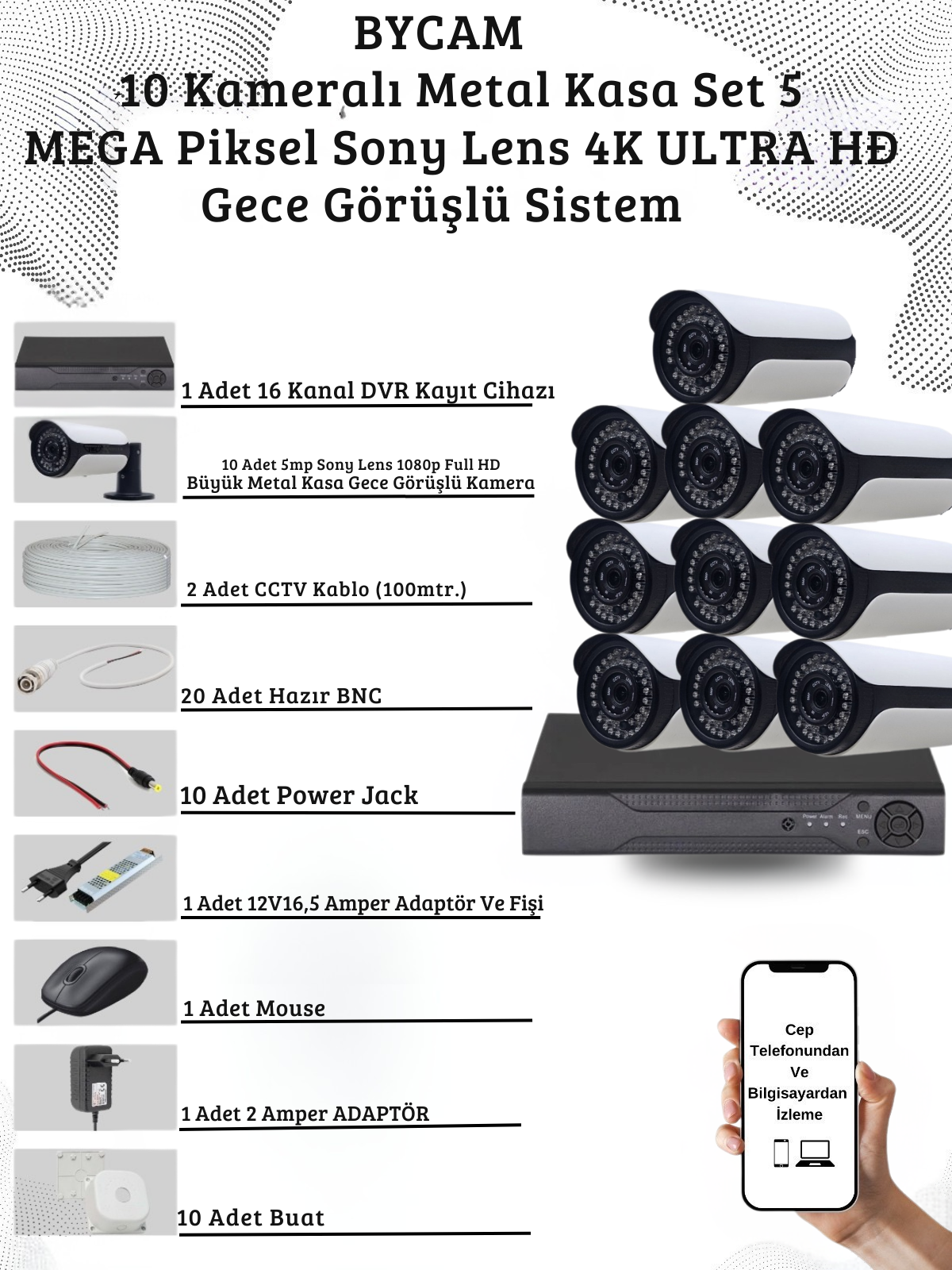 - 10 ADET 5.0 MEGAPİXEL SONY LENSLİ METAL KASA 9272 4K GERÇEK İZLEME 40 METRE GECEGÖRÜŞLÜ SU GEÇİRMEZ AHD KAMERA