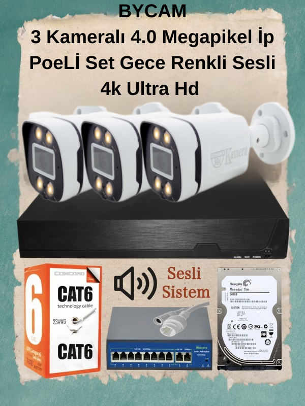 - 3 adet poeli ip kamera ( 4.0 m.pixel ) su geçirmez ve gecegörüşlü RENKLİ ve SESLİ