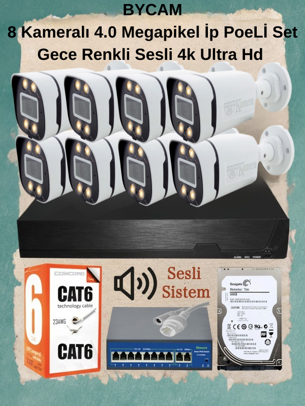 - 8 adet poeli ip kamera ( 5.0 m.pixel ) su geçirmez ve gecegörüşlü RENKLİ ve SESLİ